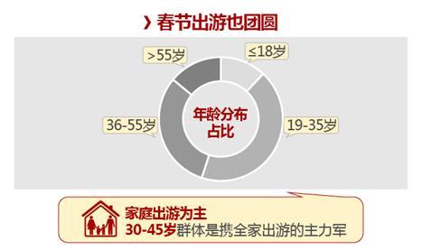 與一般節(jié)假日出游群體稍有差異的是,春節(jié)出游人群以家庭成員為主,30-45歲群體是帶著全家出游的主力軍。對于大多數(shù)上班族而言,平時全家人聚在一起的機(jī)會較少,春節(jié)期間一起出去玩,既省去了走親訪友的繁瑣,也可以讓父母從家務(wù)中暫時脫離出來。全家老少避霧霾、看風(fēng)景、品美食,其樂融融,同樣是人生最幸福的事情。