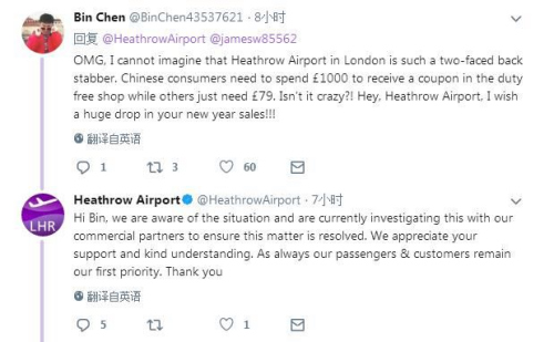 網(wǎng)友@Bin Chen:我的天哪!真難以想象希斯羅機(jī)場是這樣背后捅刀子的雙面人。中國人要花1000英鎊才能在免稅店拿到一張優(yōu)惠券,其他人就只需要79英鎊?瘋了吧?!嘿,希斯羅機(jī)場,祝您新年業(yè)績大跌!