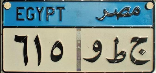 例如這張圖片是埃及的車牌,左側部分采用的是埃及通行的數(shù)字系統(tǒng)書寫,對照上文的數(shù)字系統(tǒng)對照表,可知為“615”。右側部分是阿拉伯語字母,類似于“ABC”。