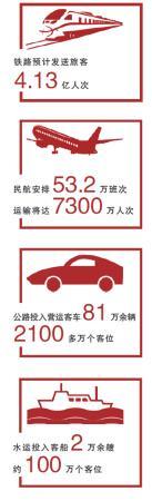 增加運(yùn)力。鐵路節(jié)前和節(jié)后分別每天安排開行旅客列車4787對和4860對,客座能力比上年春運(yùn)增長5.4%和5.2%,預(yù)計(jì)發(fā)送旅客4.13億人次;民航預(yù)計(jì)安排班次53.2萬班,比上年春運(yùn)增長約10%,運(yùn)輸將達(dá)7300萬人次;道路投入81萬余輛營運(yùn)客車、2100多萬個(gè)客位;水運(yùn)投入客運(yùn)船舶運(yùn)力2萬余艘,約100萬個(gè)客位。
