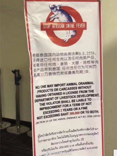 近日在網(wǎng)絡(luò)風(fēng)傳一張?zhí)﹪箶y帶豬肉制品入境的圖片:在赫然印刷著“禁止非洲豬瘟(ASF)傳染進(jìn)入泰國”的豬畫像下,有中英泰三國文字顯示:根據(jù)泰國國內(nèi)動(dòng)物疾病法案B.E.2558,不得進(jìn)口包括生豬肉在內(nèi)的任何肉類產(chǎn)品,或者將包括香腸、火腿、培根等在內(nèi)的任何肉類產(chǎn)品帶到泰國,任何違法行為可判最高20萬泰銖罰款或最高2年刑期。據(jù)泰國星暹傳媒報(bào)道,經(jīng)與泰國畜牧發(fā)展部(Department of Livestock Development)確認(rèn),網(wǎng)傳圖片信息屬實(shí)。