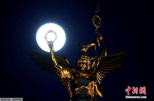 資料圖:德國柏林,月亮與勝利紀(jì)念碑頂端的金色維多利亞相映成趣。
