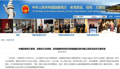 中國僑網(wǎng)12月10日電 據(jù)中國駐新西蘭大使館網(wǎng)站消息,12月9日,當?shù)貢r間下午2時11分,位于新西蘭北島豐盛灣地區(qū),距離海岸線48公里的懷特島(White Island)發(fā)生火山噴發(fā)。截至目前,新方公開消息稱,事發(fā)時共有47人在島上觀光,已確認5人死亡,8人失蹤,多人受傷入院。受傷及失蹤人員中,有中國游客。駐新西蘭使館已啟動應急機制,正與新各相關(guān)部門密切聯(lián)系,了解、確認中國公民涉事情況。目前,新方已將該座火山噴發(fā)警戒級別從4級調(diào)整為3級(最高為5級),但新專家稱這座火山在未來幾天內(nèi)有很高概率再次噴發(fā)。