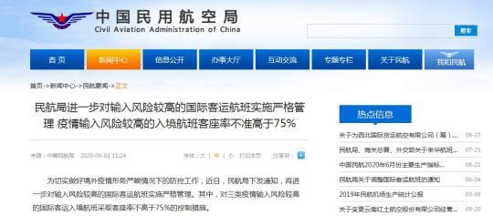 中新網(wǎng)9月1日電 據(jù)民航局網(wǎng)站消息,為切實(shí)做好境外疫情形勢(shì)嚴(yán)峻情況下的防控工作,近日,民航局下發(fā)通知,將進(jìn)一步對(duì)輸入風(fēng)險(xiǎn)較高的國(guó)際客運(yùn)航班實(shí)施嚴(yán)格管理。其中,對(duì)三類疫情輸入風(fēng)險(xiǎn)較高的國(guó)際客運(yùn)入境航班采取客座率不高于75%的控制措施。