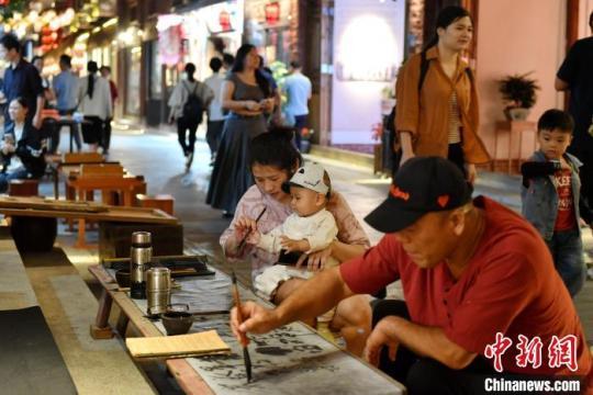 圖為游客在街區(qū)內(nèi)感受書法魅力。中新網(wǎng)記者 呂明 攝