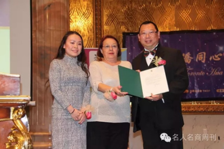 當晚,中國駐多倫多副總領(lǐng)事徐偉和華助中心全體理事成員合影留念。多倫多華助中心理事會主席鄭永麟,副主席吳雨青為贊助頒發(fā)感謝狀。約克區(qū)警察總長Eric Jolliffe 在鄭永麟主席倍同下向在場的華助中心義工代表頒發(fā)了義工感謝狀。
