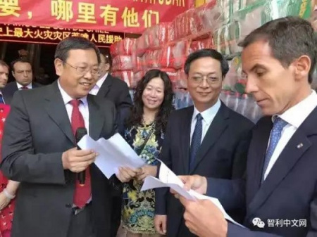 中國僑網(wǎng)2月10日電 據(jù)智利中文網(wǎng)微信公眾號消息,當(dāng)?shù)貢r間2月8日中午1點,智利史上最嚴(yán)重火災(zāi)后,華商賑災(zāi)組與圣地亞哥市政府舉行物資轉(zhuǎn)交接儀式。智利華助中心主任,智利華商聯(lián)合總會會長王何興,代表華商賑災(zāi)組將50噸物資批發(fā)價值4245.98萬(市場價值約8000多萬)的水,牛奶,油,內(nèi)衣,干糧,尿不濕等貨物及清單,在駐智利大使李寶榮,國際警察局將軍ALFREDO CHIANG CHAU 的見證下,轉(zhuǎn)交給圣地亞哥市長Felipe Alessandri(費利佩·亞歷山德里)。而后,在物資裝車時,李寶榮大使與市長費利佩·亞歷山德里首先成為貨物搬運工,現(xiàn)場令每一個人感動。