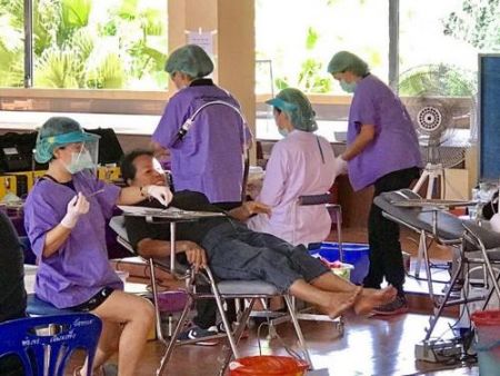 合艾華助中心理事會主席張俊貴代表華助中心捐助5萬泰銖購買麻醉及康復(fù)基礎(chǔ)藥品,宋卡王子大學(xué)附屬醫(yī)院免費(fèi)提供牙科診療設(shè)備、6名教授級的義診醫(yī)生和12名護(hù)士,獅子基金會捐助5千泰銖的物資。
