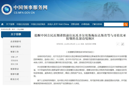 外交部領(lǐng)事司和中國駐厄瓜多爾使館提醒中國公民密切關(guān)注當?shù)鼐謩莅l(fā)展,近期謹慎前往厄瓜多爾埃斯梅拉達斯省、卡爾奇省和蘇昆比奧斯省等與哥倫比亞接壤的北部邊境地區(qū),提醒當?shù)刂袊窈蜋C構(gòu)保持警惕,加強安全防范和應(yīng)急準備,避免前往人群密集場所,確保人身和財產(chǎn)安全。如遇緊急情況,請及時報警并聯(lián)系中國駐厄瓜多爾使館。