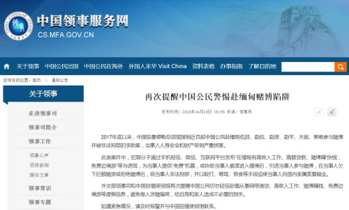 中國(guó)僑網(wǎng)4月18日電 據(jù)中國(guó)領(lǐng)事服務(wù)網(wǎng)消息,2017年底以來,中國(guó)駐曼德勒總領(lǐng)館接到近百起中國(guó)公民赴緬甸佤邦、勐拉、勐波、勐平、木姐、果敢參與賭博并被非法拘禁的求助案,當(dāng)事人人身安全和財(cái)產(chǎn)受到嚴(yán)重?fù)p害。