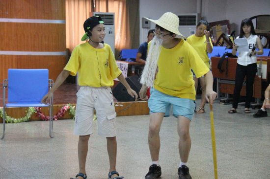 生活漢語四班的營員們上演了一出改編自經典故事的小話劇《亡羊補牢》,小演員們生動的形態(tài)動作、詼諧調侃的臺詞對話都引得現(xiàn)場笑聲一片,特別是他們對漢語的運用,通過夏令營的學習,有了明顯的改善。