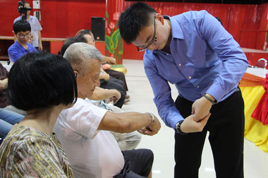 中醫(yī)專(zhuān)家張弘煥教授現(xiàn)場(chǎng)表演了太極拳并向在場(chǎng)觀眾講述了太極拳的基本養(yǎng)生方式,使大家很快領(lǐng)會(huì)到太極和中華養(yǎng)生方法的神奇之處;為使大家對(duì)自己的健康狀況有系統(tǒng)的了解,張教授還系統(tǒng)地介紹了中醫(yī)舌診,講座進(jìn)行到一半的時(shí)候,很多人已經(jīng)可以了解到自己的身體體質(zhì)特點(diǎn);接下來(lái),張教授又進(jìn)一步介紹手診的基本要領(lǐng),引導(dǎo)從小小的手指甲透視健康狀況,并針對(duì)相應(yīng)病癥提出治療與預(yù)防建議。講座中,張教授還與去年中醫(yī)健康養(yǎng)生講座的觀眾進(jìn)行了交流,一位阿姨表示她通過(guò)堅(jiān)持中醫(yī)專(zhuān)家推薦的泡腳法,睡眠有了很大的改善。