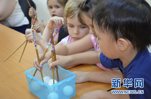 在漢語教室里,孩子們的目光迅速被“日”“月”“山”等像圖畫一樣的方塊字吸引,他們迫不及待地想要在紙上試著寫這些漢字。隨后,孔院老師還與孩子們一起學(xué)說漢語、學(xué)唱兒歌、學(xué)用筷子等。