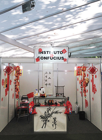 孔子學(xué)院展位懸掛著紅紅的中國結(jié)、中國燈籠,攤位上擺放著象征中國文化的毛筆、大熊貓、大鯉魚、水墨畫、竹簡等,亮麗的紅色瞬間吸引住路人的眼球。開幕式后,里約熱內(nèi)盧天主教大學(xué)校長若薩法一行來到孔子學(xué)院展位,對孔子學(xué)院成立以來取得的成績表示祝賀,并感謝孔院在巴西經(jīng)濟(jì)最困難的時候如約參加此次活動。