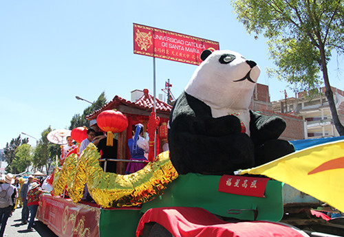 孔院今年的花車是一條色彩鮮艷、威武強(qiáng)勁的巨龍,象征著強(qiáng)大耀眼的中國(guó)。車廂前面是傳統(tǒng)的紅色亭子,四周由大紅燈籠、中國(guó)結(jié)、春聯(lián)等裝點(diǎn)一新。中間是一只憨厚可愛(ài)的大熊貓,緊接著是象征阿雷基帕的Misti雪山,最后是一條插翅欲飛的金龍。花車后廂的橫幅上用西語(yǔ)寫著“漢語(yǔ)改變你的未來(lái)”。