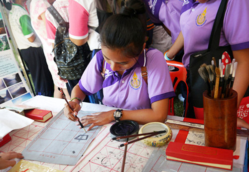 此次活動(dòng)由中國文化展和中華民族服飾秀組成。其中,中國文化展包括中國結(jié)、中國書法、中國紙藝、漢語教材展示等,中國紙藝又分為中國剪紙、中國折紙、中國刻紙。鮮明的中國元素,引起了泰國師生的強(qiáng)烈興趣,他們紛紛駐足參與其中。