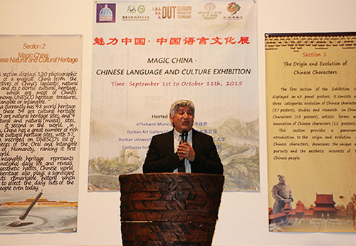 該展覽由德班理工大學(xué)孔子學(xué)院、南非德班市政府、德班市藝術(shù)展覽館和德班理工大學(xué)聯(lián)合主辦,南非-中國人民友好協(xié)會協(xié)辦。開幕式由德班市政府外辦主任埃里克·阿坡格林(Mr Eric Apelgren)主持,南非基礎(chǔ)教育部首席教育專家瑞斯(Mr WAP Ras),德班市議長羅吉·奈度(the Speaker Mr Logie Naidoo),德班理工大學(xué)校長阿邁德·巴瓦(Professor Ahmed C Bawa)、德班市藝術(shù)展覽館館長代表圖拉尼·瑪卡雅(Mr Thulani Makhaye)、德班理工大學(xué)孔子學(xué)院外方院長格雷姆·斯圖爾特(Professor Graham Stewart)等先后致辭。