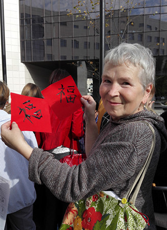 中國民間傳統(tǒng)工藝剪紙體驗中,體驗者疊紙、畫字型,然后親自剪出“喜”字和“春”字,并在字邊用花章蓋出不同的花樣;書法體驗桌旁,參與者學(xué)習(xí)了漢字的基本筆畫,然后寫出自己的心愿,一幅幅“愛”“?!薄昂推健钡戎袊鴿h字躍然紙上;古老的中國結(jié)體驗區(qū)也吸引許多參觀者圍觀,他們分別學(xué)會了編雙線結(jié)、紐扣結(jié)、盤長結(jié),對中國結(jié)藝術(shù)表現(xiàn)出濃厚的興趣。