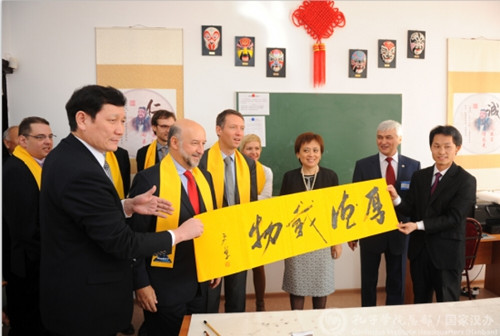 Francis Etienne大使在講話中指出,中法兩國是友好國家,兩國民眾也交往頻繁,他盛贊該孔院在漢語教學和中國文化推廣方面取得的成績。隨后,代表團參觀了中國文化展板走廊、語音教室和中外方院長辦公室等辦公、教學設施。漢語教師趙彥軍現(xiàn)場揮毫書寫“厚德載物”四個大字。