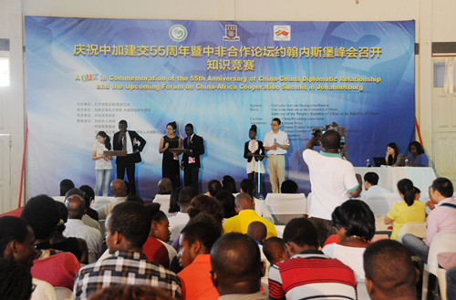 “慶祝中加建交55周年暨中非合作論壇約翰內(nèi)斯堡峰會召開知識競賽”分為預(yù)賽和決賽。預(yù)賽在加納大學(xué)孔子學(xué)院舉行,勝出的10名加納選手和10名中國選手組成10組中加聯(lián)合參賽隊參加決賽。10組選手在決賽中回答了關(guān)于中加兩國國情和中加政治、經(jīng)濟、文化、人文交往以及中非關(guān)系方面的問題,賽況精彩激烈,觀眾反響熱烈。孫大使和阿杰曼部長全程觀看了知識競賽,并為獲獎選手頒獎。