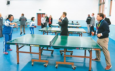 美國校長們在運動館里和中國學生打起了乒乓球