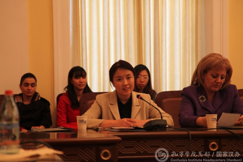 隨后,與會人員就亞美尼亞中小學漢語教學的前景問題與合作方式進行了深入探討。亞美尼亞中小學聯(lián)盟負責人姆拉江高度肯定了孔子學院與中小學聯(lián)盟的合作。多所中小學的校長表示,將盡快申請開設(shè)漢語課程,為自己學校的學生提供更好的發(fā)展機會。斯捷潘納凡市“圖馬尼揚”學校校長姆克爾江表示,在亞美尼亞推廣漢語就是在進一步鞏固兩國友誼,如果世界上沒有友誼,就像沒有太陽一樣暗無天日,她還在發(fā)言最后激動地高呼“中-亞友誼萬歲!”