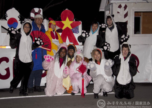 在這次圣誕節(jié)花車游行活動中,孔子學院師生熱情、積極、友好的態(tài)度和表現(xiàn),獲得了眾多參觀者的好評。當?shù)仉娨暸_全程實況錄像,被當?shù)刂髁髅襟w評選為高中組花車游行第一名。