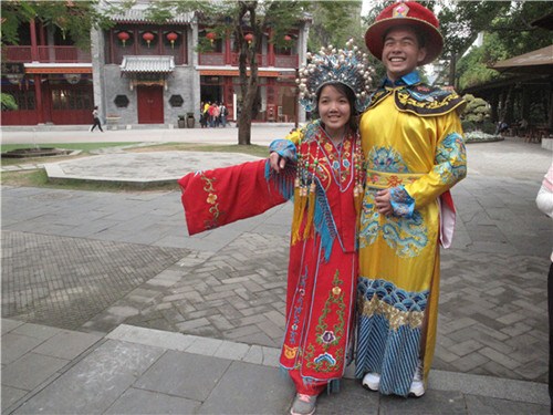 經(jīng)過一上午蓮花山的參觀,營員們略顯疲憊,不過這一點兒都不影響他們接下來參觀的熱情。在中午用餐之后。大家稍適休息,隊伍又向錦繡中華民俗村邁進。整個園區(qū)分為兩個部分,錦繡中華囊括萬里長城、故宮、布達拉宮、莫高窟等中國境內的人文微縮景觀,中華民俗文化村則展示了包括傣族的竹樓、蒙古族的蒙古包,瑤族的山寨等不同民族風情的居民區(qū)建筑。根據(jù)導游的介紹,營員們只用參觀這一個地方就可以飽覽中國錦繡河山和56個多姿多彩的民族文化。一走進進園區(qū),營員們就被園門口的民族服飾攝影所吸引,紛紛駐足拍照,玩得不亦樂乎。在參觀完園內的展區(qū)后,接著營員們一同觀看了三場精彩絕倫的表演——《金戈王朝》、《新東方霓裳》、《龍鳳舞中華》。精湛的馬術與身臨其境的金戈鐵馬表演,精妙絕倫的舞姿與流光溢彩的華服,磅礴大氣震撼的舞臺設計讓營員們一飽眼福,拍手叫絕。