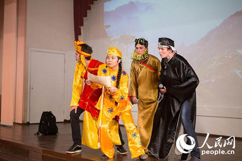 教育中心的同學們?yōu)閬碣e奉獻了歌曲、舞蹈、話劇表演等一系列精彩文藝節(jié)目。同學們自編自演的漢俄雙語話劇《唐僧師徒西天取經》融合了中國神話、民族舞蹈等大量中國元素,他們惟妙惟肖的表演贏得了大家陣陣掌聲,將整場活動推向高潮。