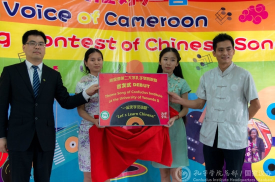 孔院本部學(xué)生大成自彈自唱,并配以現(xiàn)場(chǎng)情景劇,以一曲《親愛的小孩》奪得全場(chǎng)最高分,當(dāng)仁不讓獲得第三屆“喀麥隆好聲音”中文歌曲大賽冠軍。據(jù)了解,大成是孔子學(xué)院四級(jí)班的學(xué)生,同時(shí)也是喀麥隆小有名氣的歌星,前段時(shí)間他和雅二大孔子學(xué)院老師合作,創(chuàng)作了一首中法英三語(yǔ)歌曲《一起來(lái)學(xué)漢語(yǔ)吧》。比賽間隙大成還現(xiàn)場(chǎng)演唱了該歌曲,中方院長(zhǎng)余國(guó)養(yǎng)代表雅二大孔院宣布將該歌曲定為院歌,中國(guó)駐喀使館政務(wù)參贊孫偉為院歌首發(fā)揭牌。