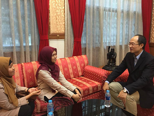 中國僑網(wǎng)5月17日電 據(jù)中國駐印尼大使館網(wǎng)站消息,近日,中國駐印尼政務參贊徐航天在使館會見即將赴華參加“新漢語”教學法培訓班的日惹卡查瑪達大學中文系主任胡愛莉和教師許敏思,為二人送行。