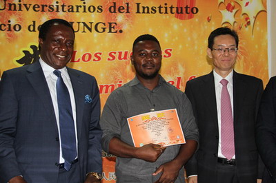 比賽分為主題演講、知識問答和才藝展示三個部分。經(jīng)過激烈角逐,最終來自赤道幾內(nèi)亞國立大學(xué)的阿洛戈(Benjamin Alogo)獲得一等獎,趙宏聲與恩圖圖姆為其頒獎并合影留念。比賽同時決出了2名二等獎選手和3名三等獎選手。