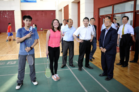 隨后,海外僑社代表在任啟亮和周虹的陪同下,參觀了學(xué)院主教學(xué)樓大廳文化墻、學(xué)生教室、圖書館、博物館、游泳館、體育館、餐廳等場(chǎng)所和設(shè)施。參觀過(guò)程中,海外僑社代表不時(shí)地在博物館展品前駐足仔細(xì)品評(píng)畫作筆法,在圖書館向華裔學(xué)生了解他們?cè)诒本┤A文學(xué)院學(xué)習(xí)的感悟和收獲,在體育館興致勃勃地與正在鍛煉的學(xué)生合影。