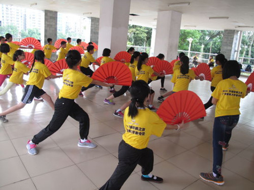 武術(shù)功夫扇講究動(dòng)作的流暢性,蔡欣宜老師在指導(dǎo)營(yíng)員們時(shí)也格外注重訓(xùn)練他們動(dòng)作的連貫和整齊。營(yíng)員們分組練習(xí),互相學(xué)習(xí),很快就揮舞出了武術(shù)功夫扇的基本招式,整齊劃一,場(chǎng)面十分壯觀。