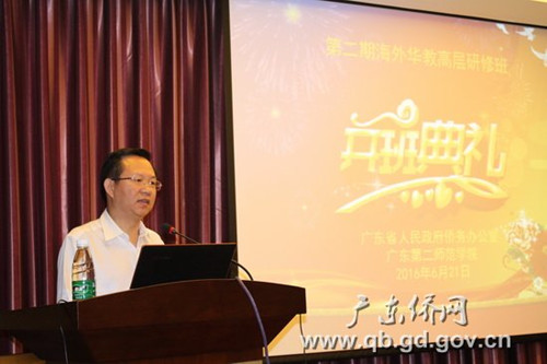 鄭建民在致辭中表示,省僑辦歷來高度重視海外華文教育工作,在“請進(jìn)來”走出去”培訓(xùn)海外華文教師、選派華文教師赴海外任教等方面做了大量工作,取得積極成果。去年廣東省僑辦首次舉辦了針對海外華教高層的研修班,反響熱烈,收效良好。舉辦海外華教高層研修班是推進(jìn)海外華?!罢?guī)化、標(biāo)準(zhǔn)化、專業(yè)化”建設(shè)的又一重要舉措。他希望學(xué)員們能充分珍惜這8天的培訓(xùn)時間,安心學(xué)習(xí),認(rèn)真領(lǐng)會,“教學(xué)相長”,與省內(nèi)各名校多互動交流,不斷提高自身的管理水平,不斷加深對中華文化的認(rèn)識和理解,推動海外華教事業(yè)的進(jìn)一步發(fā)展。(朱萍)