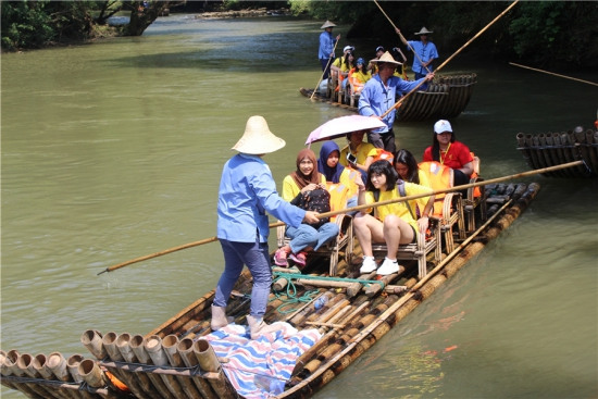 營員們一大早來到九曲溪漂流碼頭。只見九曲溪澄澈清瑩,蜿蜒曲折,兩岸壁立千仞,巍峨雄渾,景趣盎然。巖壁上留下許多艄公撐船的洞印,見證了久經(jīng)風雨的艱辛,也讓乘坐竹筏的營員們驚嘆不已。
