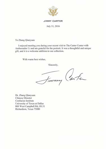 中國僑網(wǎng)9月19日電 據(jù)國家漢辦網(wǎng)站消息,日前,美國第39任總統(tǒng)吉米·卡特,分別向中國駐休斯敦總領(lǐng)館和德克薩斯大學(xué)達(dá)拉斯分??鬃訉W(xué)院致函,向該孔院原中方院長張乾元教授為其贈送水墨肖像畫表示感謝,并隨附兩份簽名合影照片。