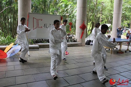 人民網(wǎng)里約熱內(nèi)盧10月6日電(記者 王海林)10月5日,里約天主教大學(xué)“中國日”暨孔子學(xué)院五周年慶典活動(dòng)舉行?;顒?dòng)時(shí)間持續(xù)一天,吸引了校內(nèi)外不少對(duì)中國文化感興趣的巴巴西專家學(xué)者及學(xué)生。里約孔院的師生們現(xiàn)場(chǎng)為大家展示了太極拳、中國民族舞蹈、茶藝、中國書法、中國剪紙等極富中國韻味的表演,除表演外,孔院師生還為所有到場(chǎng)的觀眾進(jìn)行簡短的日常漢語交流、書法、剪紙、乒乓球等現(xiàn)場(chǎng)教學(xué)。