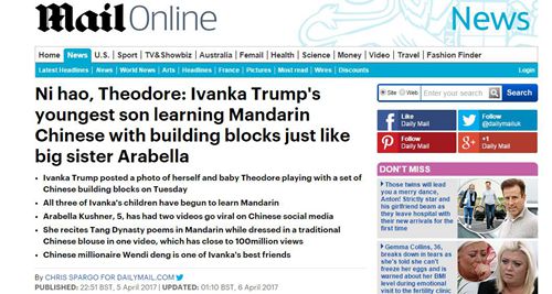 【環(huán)球時(shí)報(bào)-環(huán)球網(wǎng)報(bào)道 記者 姚麗娟】 “你好,希歐多爾:伊萬卡的小兒子和他姐姐阿拉貝拉一樣,也在學(xué)中文”,英國《每日郵報(bào)》6日刊發(fā)這條新聞,由頭是美國總統(tǒng)特朗普之女、新晉“總統(tǒng)助理”伊萬卡5日在社交媒體上發(fā)布了一張她的小兒子搭漢字積木。該報(bào)稱,這意味著伊萬卡的3個(gè)孩子都在學(xué)中文。