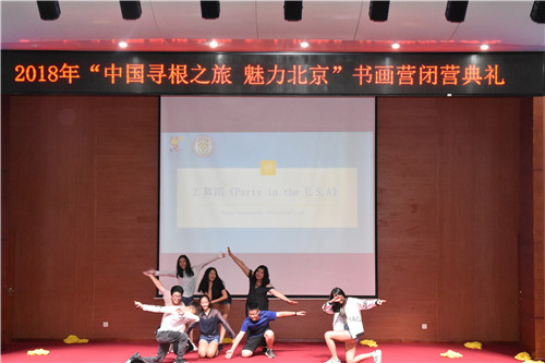 2018“中國(guó)尋根之旅·魅力北京”書畫夏令營(yíng)閉營(yíng)儀式暨匯報(bào)演出在集體大合影中落下了帷幕。整場(chǎng)演出高潮迭起,氣氛熱烈。很多營(yíng)員面對(duì)即將到來的離別依依不舍,大家期待著下次在中國(guó)團(tuán)聚,再續(xù)中國(guó)情。(張笑笑 張夢(mèng)娟)