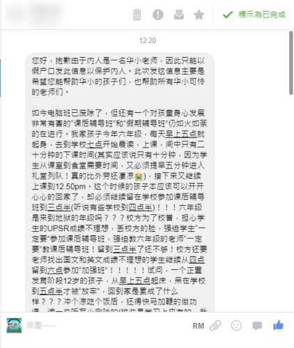 他心疼地指出,自己的妻子(華小老師)也不好過,孩子清晨5時起床,家長必須更早,到校后展開一連串工作,也被逼迫教六年級課后輔導(dǎo)班和“加強(qiáng)班”。