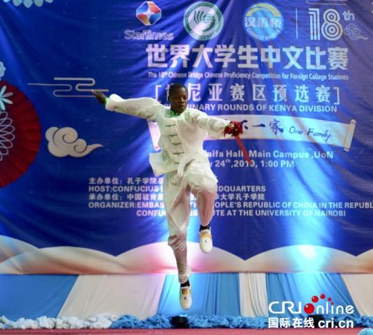 國際在線報(bào)道(中國國際廣播電臺記者 楊瓊):當(dāng)?shù)貢r間5月24日,第18屆“漢語橋”世界大學(xué)生中文比賽肯尼亞賽區(qū)預(yù)選賽在該國首都內(nèi)羅畢舉行。在3個多小時的角逐中,來自肯尼亞四所高校孔子學(xué)院的學(xué)生們的精彩展示,猶如一場中文及中國文化的藝術(shù)盛宴。