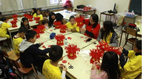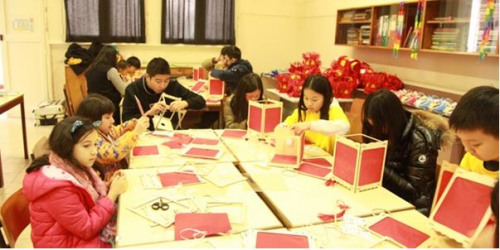 在宮燈制作的課堂上,孩子們擺燈架、穿燈線、剪圖案,認(rèn)真學(xué)習(xí)如何搭建宮燈框架,并在底部綴上紅色的中國(guó)結(jié),一盞盞充滿傳統(tǒng)韻味的宮燈便制作完成……