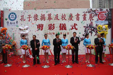 華聲報(bào)廣州訊(記者 王凱):11月16日是暨南大學(xué)百年校慶日,孔子銅像的節(jié)目及書畫展剪彩儀式揭開了這一盛大慶祝活動(dòng)的序幕。暨南大學(xué)校長(zhǎng)胡軍、副校長(zhǎng)陸大祥、校董梁仲景、孔子銅像設(shè)計(jì)者胡江以及杜滋齡、陳金章、陶為淵、朱榮華、徐文實(shí)等藝術(shù)界名流出席了儀式。