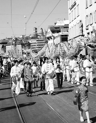 學(xué)校還積極鼓勵(lì)孩子們參與當(dāng)?shù)厣鐓^(qū)活動(dòng)。比如,蘇黎世每年一次的送冬節(jié),就為我們提供了一個(gè)很好地向歐洲乃至世界展示中國(guó)文化的契機(jī)。以蘇黎世標(biāo)準(zhǔn)中文學(xué)校為主的兒童方隊(duì),連續(xù)5年參加了這一當(dāng)?shù)厝嗣褶o舊迎新的盛大游行活動(dòng)。孩子們身穿獨(dú)特的中國(guó)民族服裝,手拿精巧的工藝品,敲打著中國(guó)鑼鼓,把中國(guó)龍也舞上了蘇黎世的街頭,在蘇黎世市民尤其是兒童中引起了極大的轟動(dòng),當(dāng)?shù)孛襟w和瑞士電視臺(tái)都陸續(xù)報(bào)道了我們的方隊(duì)。