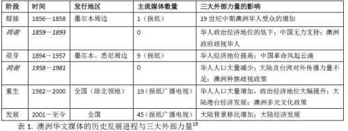 本文主要以澳洲和美國(guó)華媒為例子,深入分析、比較海外華媒如何在生存大三角-三大外部力量控制下的歷史發(fā)展進(jìn)程。案例選擇的原因有三個(gè)。一是兩國(guó)華媒數(shù)量、種類繁多、歷史悠久,分別誕生了最早的海外華文報(bào)紙和海外中英文雙語(yǔ)報(bào)紙,另?yè)?jù)2017年9月世界華文傳媒論壇統(tǒng)計(jì),兩國(guó)分別有華文報(bào)紙、廣播、電視、網(wǎng)站等共86家和45家。在163年的歷史中,兩國(guó)華媒也都出現(xiàn)過(guò)三次繁榮和兩次低潮。原因二是兩國(guó)是海外華人的主要聚居地之一,不僅華人華媒眾多,而且對(duì)全球和中國(guó)都有重要影響。原因三是兩國(guó)都是世界上有影響的資本主義國(guó)家,社會(huì)結(jié)構(gòu)相似,又實(shí)行多元文化政策。在這其中,澳洲華媒在百年歷史中出現(xiàn)過(guò)國(guó)際傳播史上罕見(jiàn)的兩次長(zhǎng)時(shí)間“??焙腿巍胺睒s”,特別能體現(xiàn)三大外部力量的作用。所以,本文又以澳洲華文傳媒為例深入分析,同時(shí)比較美國(guó)、加拿大、新西蘭以及西歐等地的華媒情況,從而挖掘左右它們發(fā)展的規(guī)律與力量。