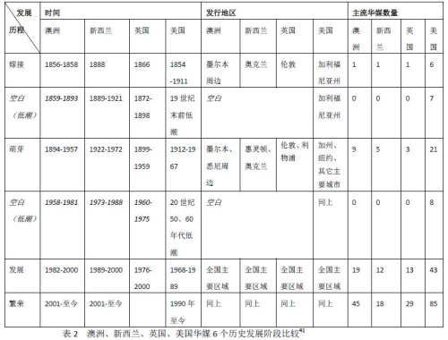 比較與澳洲相隔遼遠(yuǎn)的美國(guó)華媒、乃至加拿大、英國(guó)、新西蘭等國(guó)的華媒歷程,能證實(shí)全球華媒發(fā)展歷程的相似性,盡管它們?cè)谔炷虾1?,但基本都?jīng)歷了“萌芽”、“低潮”、“新生”、“低潮”、“發(fā)展”、“繁榮”階段,而原因都是“生存大三角”的決定性影響。