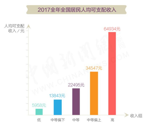 國家統(tǒng)計(jì)局的數(shù)據(jù)顯示,2017全年全國居民人均可支配收入25974元,中位數(shù)為22408元。按全國居民五等份收入分組,低收入組人均可支配收入5958元,中等偏下收入組人均可支配收入13843元,中等收入組人均可支配收入22495元,中等偏上收入組人均可支配收入34547元,高收入組人均可支配收入64934元。