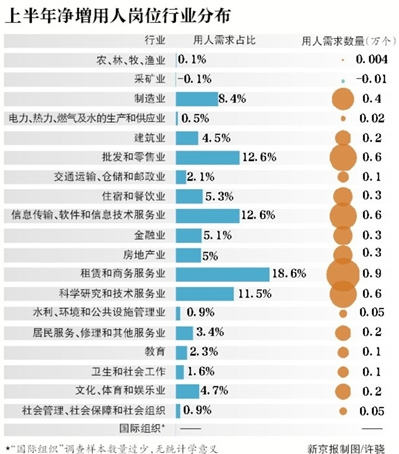 北京市職業(yè)介紹服務(wù)中心主任宋曄表示,北京上半年用人需求的缺口總量并不大,不過仍然存在結(jié)構(gòu)性矛盾?!半S著北京‘四個中心’功能的不斷顯現(xiàn),科學(xué)研究和技術(shù)服務(wù)業(yè)、文化創(chuàng)意產(chǎn)業(yè)等領(lǐng)域的用人需求更多”。