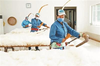 黃翠萍介紹,其中敲彈工藝是整個手工棉被的靈魂,也是“彈棉花”的“彈”字所在。利用彈弦的震動使棉花纖維打開,形成豐富的蓄熱空間。再將整床棉花作為整體進行細致的敲彈。使得手工棉被有著獨特的蓬松性和柔軟性?!罢麄€過程要敲彈7000多下,背面會被3000多根牽紗的紗線固定,最終經過打磨和縫制,歷經3個小時才能完成一條被子的制作?!?/p>